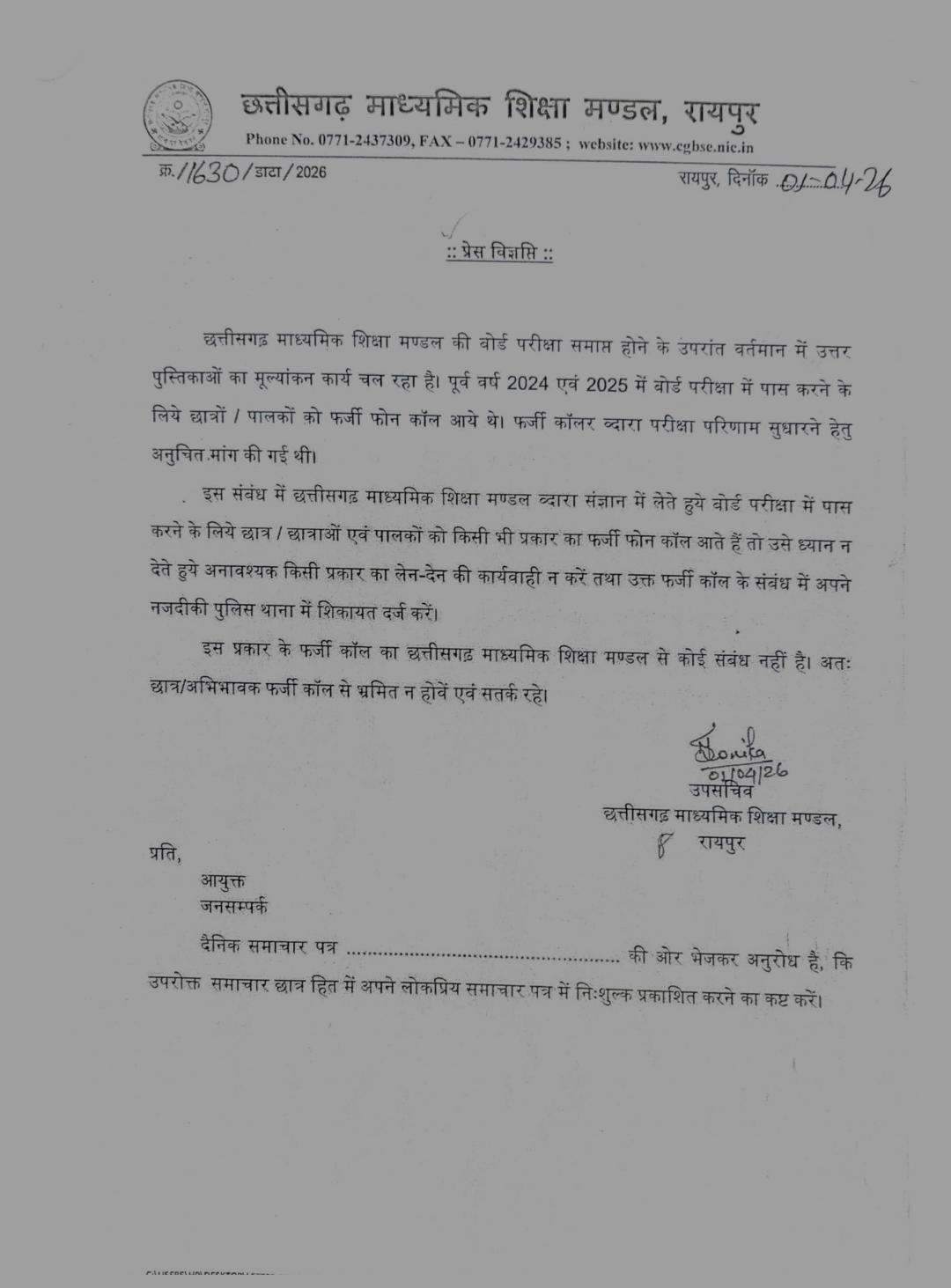 रायपुर। छत्तीसगढ़ माध्यमिक शिक्षा मंडल (माशिमं) की 10वीं और 12वीं बोर्ड परीक्षाओं की उत्तर पुस्तिकाओं के मूल्यांकन का कार्य इन दिनों जोरों पर है। इस बीच, परीक्षा परिणामों में हेरफेर करने और नंबर बढ़ाने का प्रलोभन देकर ठगी करने वाले असामाजिक तत्व भी सक्रिय हो गए हैं। इसे गंभीरता से लेते हुए माध्यमिक शिक्षा मंडल ने छात्र-छात्राओं और उनके अभिभावकों के लिए आवश्यक दिशा-निर्देश जारी किए हैं।