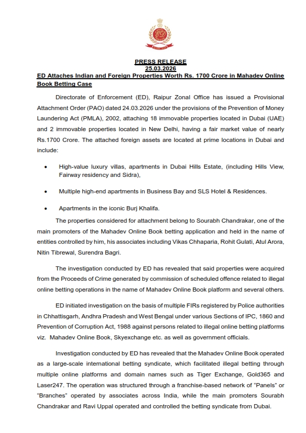 रायपुर: महादेव ऑनलाइन सट्टा ऐप (Mahadev Online Betting App) मामले में प्रवर्तन निदेशालय (ED) ने अब तक की सबसे बड़ी…