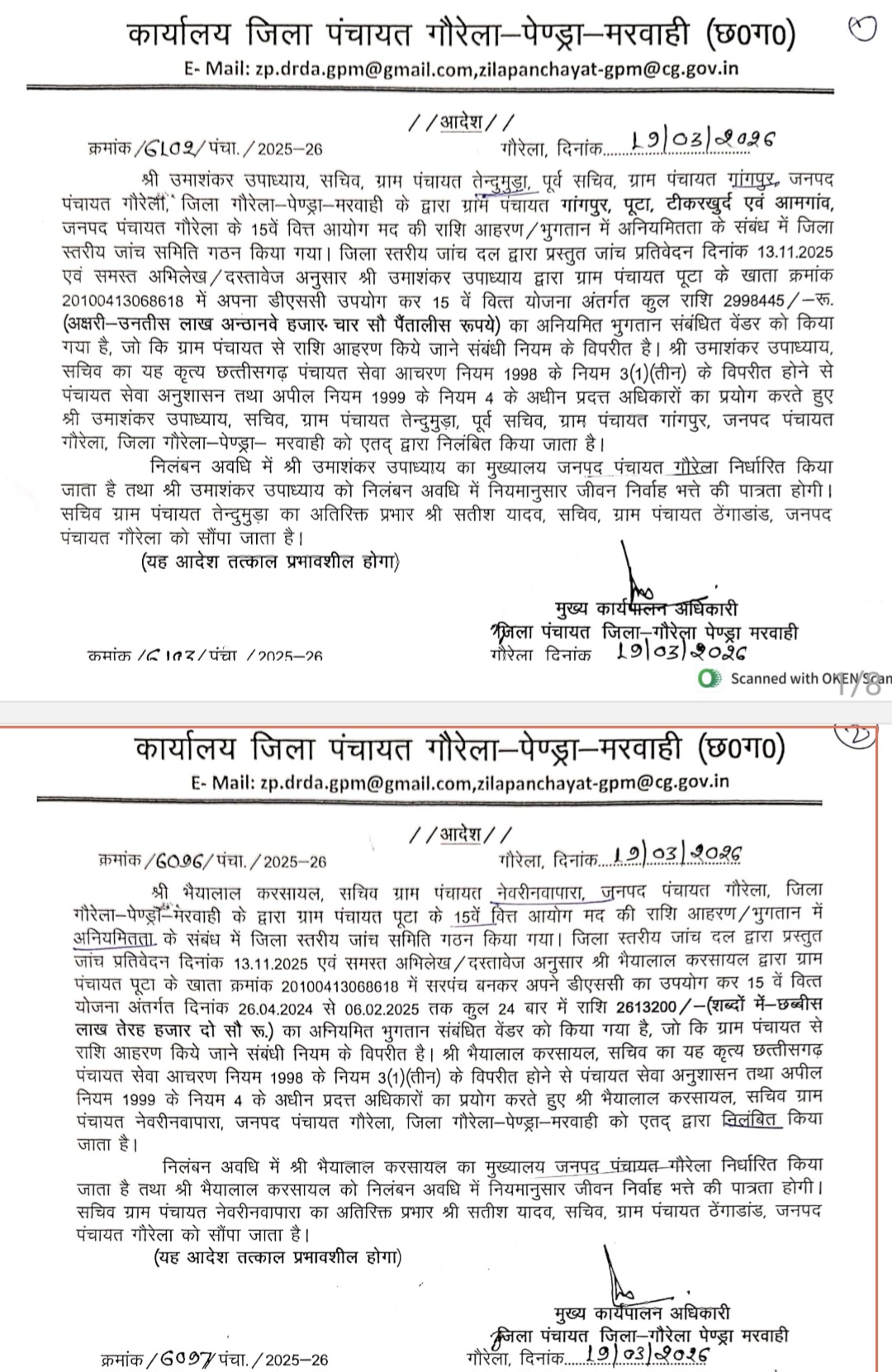 गौरेला। छत्तीसगढ़ के गौरेला-पेंड्रा-मरवाही (GPM) जिले से भ्रष्टाचार की एक बड़ी खबर सामने आ रही है। पंचायत विभाग में 1 करोड़ 19 लाख 56 हजार रुपये की भारी अनियमितता और अवैध भुगतान का खुलासा हुआ है। इस मामले में जिला पंचायत सीईओ ने सख्त रुख अपनाते हुए बड़ी कार्रवाई की है।