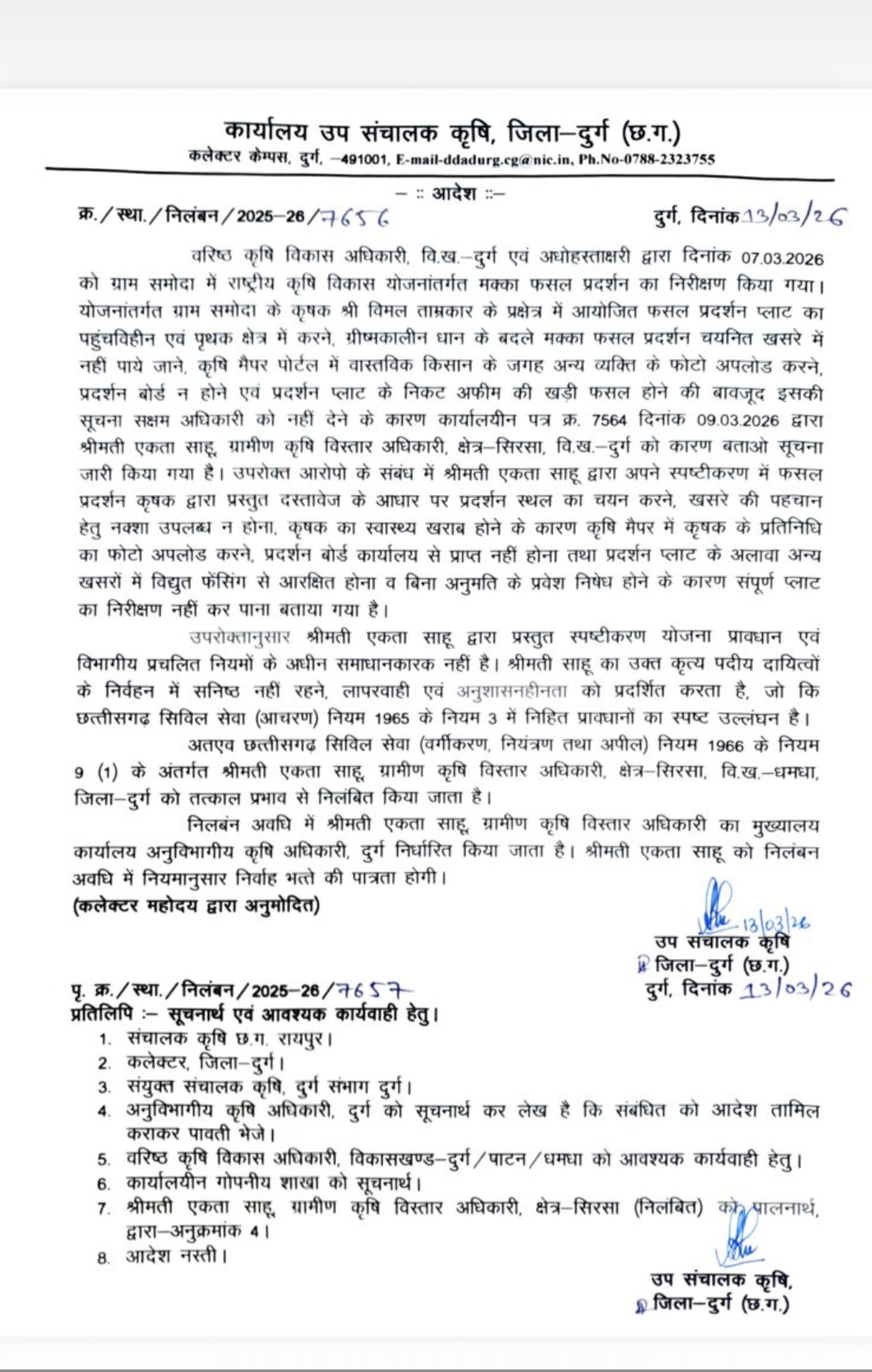 दुर्ग /दुर्ग जिले के समोदा गांव में अवैध अफीम की खेती के मामले में अब प्रशासनिक कार्रवाई तेज हो गई है। इस मामले में बड़ी लापरवाही सामने आने के बाद ग्रामीण कृषि विस्तार अधिकारी एकता साहू को निलंबित कर दिया गया है। कलेक्टर अभिजीत सिंह ने पहले ही तीन अधिकारियों को कारण बताओ नोटिस जारी किया था, जिसमें ग्रामीण कृषि विस्तार अधिकारी एकता साहू, फसल सर्वेयर शशिकांत साहू और ग्राम समोदा की पटवारी अनिता साहू शामिल हैं। वहीं कलेक्टर अभिजीत सिंह ने कृषि विस्तार अधिकारी एकता साहू को आज निलंबित कर दिया है।