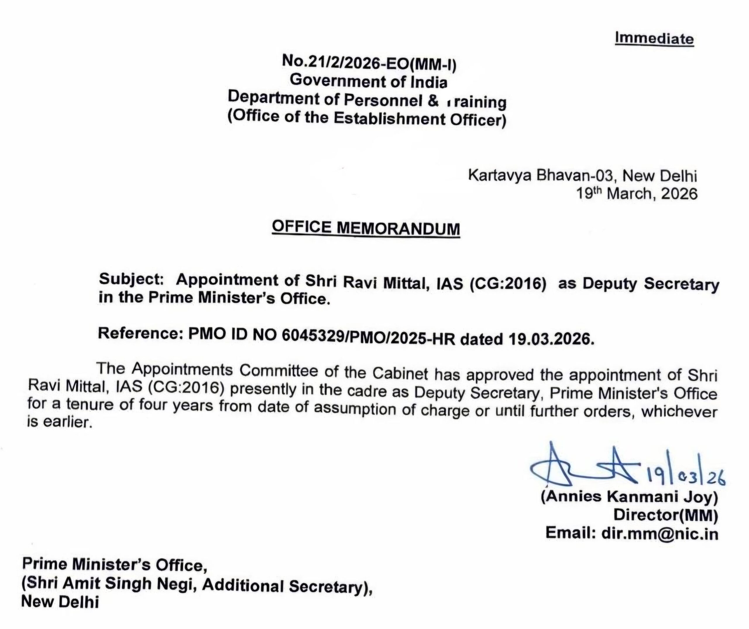 रायपुर /छत्तीसगढ़ के प्रशासनिक खेमे से इस वक्त की बड़ी खबर सामने आ रही है। छत्तीसगढ़ कैडर के तेजतर्रार आईएएस अधिकारी रवि मित्तल को केंद्र सरकार ने एक अहम जिम्मेदारी सौंपी है। उन्हें सीधे प्रधानमंत्री कार्यालय (PMO) में उप सचिव (Deputy Secretary) के पद पर नियुक्त किया गया है।